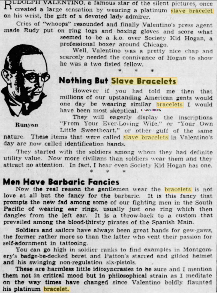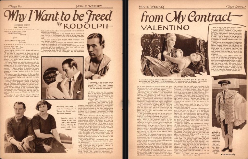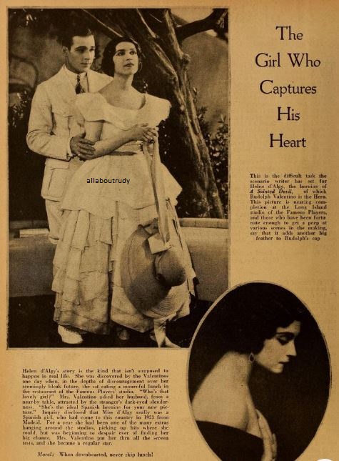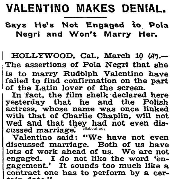 When Natacha Rambova beautiful but practically unknown dancer and costume designer, became the bride of Rudolph Valentino at a hurry-up wedding on the downside of the Mexican border a couple of years ago, she was probably the most envied woman in America. “Imagine being the Sheik’s wife” said feminine movie fans. “Some women have all the luck and who is she anyway”? They heard she was a society girl interested in a career, Winifred Hudnut, stepdaughter of the perfume maker. They also heard that she had taken over the business end of Rudy’s work and was doing a very good job as adviser and general manager. Then word went out the Sheik and his wife had separated. She’d gone to Paris for a divorce. The most romantic marriage in America was all over. “Professional Jealousy” said the fans then. Each of them was afraid of losing prestige to the other and there you are! But professional jealousy was only a contributing cause; it was one of the pinpricks that widened the rent in the fabric of the Valentino’s marital relationship. The rent, says the exotic Natacha, was decreed by destiny. It’s part of an amazing story she tells; a story of ancient associations in a bygone century; the mystic doctrine of reincarnation; of the inexorable law of karma. “Rudy and I separated” she said, “because our time together in this life had run out. We came together because there was something some problem, perhaps left over from a past life to be worked out. I was necessary to him and possibly he was necessary to me. “I have no idea what the problem was. It was not given to us to know the details in this scheme of fate. But I do know that it is over. The problem was solved for all time. I do not believe that we will ever meet again in any future existence. Mrs. Valentino talked with curious oriental calm, her long dark eyes shining. She was tall and slender flowing in black satin, embroidered with mauve and pearl gray. A twist of black silk was wound around her head, turban-wise. She was like a figure from a Chinese vase in an incredible setting of black and orange. Black rugs; a black taffeta divan; orange silk against the windows and the sun coming over New York roofs. A figure of Krishnu against one wall opposite an antique Virgin and Child across the room. Leda and the Swan in porcelain, almost life-size; queer Chinese prints. The only modern touch in the room was a big sheaf of American beauty roses. And the girl who calls herself “Natacha” because she resents the commonplaceness of “Winifred” rested against black taffeta and told of the life she lived with her Sheik seven hundred years ago! Perhaps Rudy was a real Sheik then. She doesn’t know. It was in the Iberia of the Moors, before the Spaniards came down from the North and spread oppression over the land. “We lived in the south of Spain, where even today stands relics of Moorish domains” Mrs. Valentino explained. “The Moors really were Arabians, you know. I visited Spain last summer and wandered through the South. It was vaguely familiar; I felt that I was not in a strange land. You know the feeling that comes over you sometimes that you’ve been in a place before. It’s something you can’t explain by any logical means unless of course, you understand the theory of reincarnation, the progress of a spirit from life to life, working out destiny in new bodies under new conditions and environment. “What we are today is what we have worked out in the past. What we gain in each life is credited to the next, but the problems we do not solve go over to a future existence. That is Karma, the law of eternal balance. “I don’t know what my status or conditions were in medieval Spain. But I know I was a girl who was somehow in subjection”. Mrs. Valentino does not clearly remember herself in yashmak and trousers awaiting, behind harem walls the pleasure of a dark-skinned sheik resembling the handsome film hero she is divorcing. But she has a feeling of having known him at that period. “Sometime when we are ready to know everything is revealed to us” she said. I don’t know that I was married to Rudy then. But it seems likely, doesn’t it? Mrs. Valentino is astonishingly familiar with medieval Spanish and incidentally Moorish history. She declares all culture in Europe originated with the Arabs the Moors she asserts, maintain marvelous colleges in the 13th and 14th centuries and all the learned and brilliant minds of the time were Moorish. “In the day of Pedro el Cruel they were called barbarians by people who could neither read or write” she went on. “And that was when Arabic was the court language everywhere”! It is not only medieval Spain that Mrs. Valentino says she remembers however, There was an earlier existence that comes back to her through her artistic leanings and love for color. Once so long ago that she cannot guess at the century she wandered in the rose gardens of ancient Persia. “Our likes and dislikes” she explained, “are something more than just casual results of training and environment. Those things give no satisfactory reason for a very modern person preferring for example, Greek architecture to the up-to-date style of building that we have now. My own education has nothing to do with my liking for the brilliant color and bizarre mannerisms in clothes and architecture that were a part of old Persia. I have never been in the Near East, and yet I feel at home there. And I have adopted some of the customs, especially those having to do with dress, because they are perfectly natural to me. She mentioned the twist of silk she wears on her head in place of a hat. It has been two years since I have worn a hat. And a striking feature of her house costume is a long loose-fitting coat of heavy satin, embroidered in the design of peacocks and other fanciful designs associated with Persia. “Besides” she added, “I have other information about my life in Persia. It comes to me