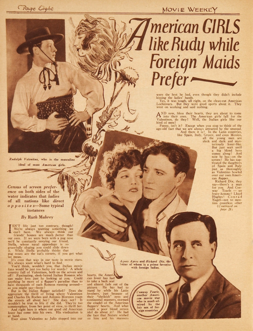 “When asked why she married Valentino, she replied, “It was simply a case of California, the glamour of the Southern moonlight and the fascinating love-making of the man.”–Jean Acker, Former Wife of Rudolph Valentino