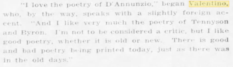 Gold shot with fire, Song of love on a silver lyre, gone! But the thread of remembered delight weaves through the dull stuff of day and night. My pattern of bright embroidery! That is what Valentino meant to millions of women and perhaps millions yet to come. Not just the perfect lover the perpetual lover