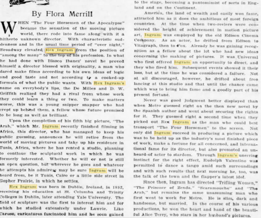 The story of Alice Terry has the same fairy tale quality as Valentino’s own. Like him, who had worked hard as an extra for many years and the hard work had resulted in little recognition. However, discouraging as had been her experience, it was not without results. For Rex Ingram happened to see her in NY when, as a girl, still in her mid-teens, she played with Bessie Barriscale in “Not My Little Sister”. The promise which she gave impressed the young director almost immediately. When indeed, he moved from NY to the coast, he welcomed the fact that she, too, had shifted from East to West. Had it not been for the war, in fact, Alice Terry would probably have been his leading lady some years before. When Ingram on his return from overseas service finally located the job which put a roof once more over his head and civilian clothes again upon his back, he was to resume his slight acquaintance with Miss Terry. For she came to his office then applied for a position as script girl, the functionary who, working on the set, chalks off the scenes as they are made and notes the new ones extemporized. He looked at her in amazement. “What”, cried he, “you don’t mean to say that you’ve given up acting do you?” She looked at him somewhat sadly, “Oh dear, yes,” she replied, “I did that sometime ago. It was too discouraging I wasn’t getting any place, you see. No matter how hard I worked nothing seemed to come of it. And of course being an extra or getting some bit now and then does not keep you. So I decided I’d just get a regular job.” “And what have you been doing since”? Inquired Ingram. “I’ve been working in the cutting room,” replied she, “and that was fine I mean it. Knowing just what you were going to get each week. But the ether commenced to get into my lungs that’s why I’m looking around for something else.” Ingram promised to give her the desired position in the picture following “Shore Acres”. However, something changed his plans and instead he case her for a wild and wooly Drury Lane melodrama called “Hearts are Trumps”. To his surprise she seemed loath to accept this chance of returning to the movie screen. “Oh no, I don’t want to try I’ve give it all up you see” she kept protesting in a way that showed how completely previous discouragements had shattered her self-confidence. But he finally succeeded in overcoming her fears, and since then she has been his leading lady in every story except “Piffling Women”. It was not, however, until the appearance of “The Four Horsemen” that Alice Terry, the girl who, heartsick from her discouragements on the set, had wanted to retire to the comparative obscurity of script work, won the wide recognition her beauty and her screen personality had so long deserved. All this I have just related I heard from Miss Terry now Mrs. Rex Ingram, on the same evening when Ingram told me of his experience working with Valentino. On this same occasion she and her husband mentioned that her next appearance will be in John Russell’s “Passion Vine”. In this her support will be Ramon Navarro, another dancer from whom Ingram predicts a success which may even duplicate that of Valentino. Both Valentino and Navarro, Ingram made an interesting observation. “A good dancer” he said, “frequently makes a good screen actor”. Why? Because he has both poise and repose, and I don’t know any better start than these. In this connection.