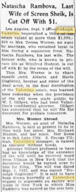 My mother, Sally Phipps was only three years old and the veteran winner of several beautiful baby contests when she appeared as the Baby in the film “Broncho Billy And The Baby.” It was made at the Niles California Essanay Studio in late 1914. Her memories of the early years at Essanay include sitting on Charlie Chaplin’s lap and enduring a frightening stage coach accident. In her teens, she was a Fox Studio star appearing in 20 films, including a cameo in the classic “Sunrise.” There were bad times also. She was on the set of her Fox two-reel comedy “Gentlemen Prefer Scotch” in 1927 when word reached her of the tragic death of her father, a state senator. But in that same year, she was selected as one of the 13 Wampas Baby Stars, starlets that were considered destined for future success. Despite her popularity in Hollywood, she left for New York where she became the darling of gossip columnists, particularly Walter Winchell. She appeared in two Broadway shows, made a Vitaphone comedy short, and married and divorced one of the Gimbel department store moguls before she darted off for India and around the world travel. Back in New York, there was another marriage, two children, and later a stay in Hawaii. Earl Wilson wrote about her in 1938 when she was working for the Federal Theatre Project during the WPA period — headlining his column “Wampas Ex-Baby Lives On WPA $23 – And Likes It.” She received the Rosemary (for remembrance) Award shortly before her death in 1978. Her images — especially her pinup photographs — have become highly collectible. Although Sally may never have met Natacha Rambova, she claims to have rented an apartment previously owned by her, a fact corroborated in several contemporary newspaper articles. The unit was in an apartment building at 320 East 57th Street, near Sutton Place. Sally rented the apartment for a period during her September-May stint, playing the ingénue in the Kaufman and Hart comedy hit “Once In A Lifetime” during the 1930-1931 Broadway season. Sally Phipps was always attracted to the occult world and through it developed several close friends. One of these was George Wehner, whom she first met in 1933. They stayed friends throughout the 1930s, with an interruption in the fall of 1939 when Sally left for a one-year stay in India. After she arrived back in New York City in February 1941, Sally phoned Wehner to tell him she was in town. A man answered the phone — Alfred Marion Harned, my future father. He took Sally’s message, since Wehner was not at home. Several months previously, Wehner had hired Harned, a local New York City orchestrator, composer, copyist, and instrumentalist, to write out the orchestral parts for his new Piano Concerto No. 1 – for 27 different instruments of a symphony orchestra. Harned had consented to take up residence in Wehner’s house during the multiple month process, so that he and Wehner could work together intensively without interruption. Several days after Sally’s leaving the phone message and then having been welcomed back by Wehner, she was invited to a séance at his house where she met Harned in person. Within six months, Sally and Harned were married. They left New York in June, eloped to Mexico, and were wed there in August. As a final note, the Piano Concerto No. 1 did get premiered in August 1941 at the Sculpture Court of the Brooklyn Museum, performed by the New York City Symphony Orchestra, with soloist Greta Lederer.
