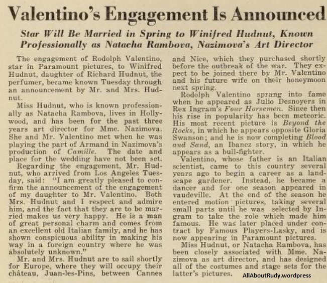 Verily, Natacha Rambova seems to be the Patsy of the motion picture business of late. The papers leaped at the story which the gallant Rudy pulled as the cause of the separation which, by the time this appears, will have developed into a Parisian divorce decree. Natacha, he says, is not a home body. She didn’t want children. She would not cook the spaghetti. She was fond of dogs. She wanted to work. His reflected glory did not satisfy her. She wanted her own career. Bunk! Bunk served with piffle sauce. Great publicity for Rudy. But old stuff. Do you remember the way Gloria Swanson set the dear old souls of Paris wild overheard when she said she wanted five or six children? I believe she meant it, because I have seen her with her two children. She adores them. But I have heard of Mr. Valentino hanging around an orphan asylum, and I cannot quite visualize the picture of the sheik walking the floor of a cold California night crooning to Junior asleep. It was not, in my opinion, playing the game to make an effort for sympathy and publicity at the expense of the woman even if it were true which I doubt. And we must hand Mrs. Valentino credit for her attitude in the whole matter. She would not live with him and his friends, told him so, get out, leaving her belongings to him, and went on her way, avoiding any opportunity to publicize herself at his expense. Divorce is no joking matter, but I cannot hold back a little snicker at Rudy crying on the shoulders of the public yearning for kiddies. There is nothing vindictive or downright mean about Valentino. He’s a pleasant chap and a fine actor, whose delusion is that he is also a business man. Natacha has been criticized for managing his affairs. But we have got to admit that in this case her management was much more commendable than his. And to add to her troubles, the F.B.O Company, for whom Miss Rambova made a picture because she needed the money changed its name to “when love grows cold” after it was finished, with the frank purpose of capitalizing her marital troubles. Miss Rambova protested that it would harm her and create the impression that she was the one who was profiting by deceiving the public into believing it was a screen revelation of their love wreck.