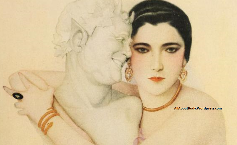 collar on his overcoat. Great guns, what a man. And the wrises watch worn on a slave bracelet? It gives us a horrible sinking feeling at the pit of the stomach to know that within the next few days tailors and clothing stores will be swamped with requests for green suits, think overcoat buyers will demand beavor collars, tha jewelers will be besought for slave bracelets whatever they are Just like Valentinos. Sadly we acknowledge ourselves that this will happen. “Rudy says he tried to make his wife happy. But a man with my particular temperament being very suspectible to any kind of beauty, whether in feminity or art really hasnt any business with a wife. There always is that feeling of disatisfaction; that consciousness of the women in the background.” As they say in vaudeville and they shot Lincoln. “Rudy doesn’t like marriage because it cramps his style. He says there is too much fun to be found afield to be tied down by the conventions of monogamy. Rudy is a strayer, is this lover of things beautiful? Blood will tell. Heredity and early environment do mold the individual. Green suit, beaver collar, slave bracelet adorning this Don Juan. whos too self-important, too bent on gratifying his fancies, to fancy marriage. Rudys nothing more than a spaghetti-gurgling garnders helper, product of modern feminishm, and all the wishy-washy feminine gurgling in the work cant change him. Thank god for five-yard McCarty.