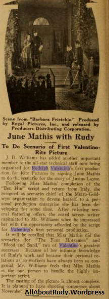 Shortly before his departure for NY on the trip that ended with his death, Valentino and Ullman are said to have signed an agreement with the Beverly Ridge Company for the purchase of 110 acres of hills, stretching from Falcon Lair, the Valentino home to the Chaplin and Pickford-Fairbanks estates. The property was to be cut up into home sites of five and ten acres each and sold to members of the film colony. Pola Negri was among those who had agreed to build on the land, according to the report. It was the plan of Valentino to erect a stone wall enclosing the entire tract, with gates keepers lodges at the three entrances. Behind these walls, the residents of Valentinotown were to live shielded from the gaze of curious tourists. The property was valued at approximately a million dollars, the Hanson Finance Company holding a mortgage for $700,000. Valentino and Ullman when they signed the contract calling for the payment of $140,000 within sixty days also issued a note for $20,000 payable in thirty days. The note fell due as the actor lay on his deathbed. Then the contract expired, Ullman failing to make good the $140,000. As a result of this, the Hanson Finance Company foreclosed on the property, throwing the Beverly Ridge Company into bankruptcy, according to attorney Andrews. Beyer as receiver has made several demands on Ullman for the amount of the note and the contract. On the advise of Attorney Gilbert, these have been ignored, resulting in the notice by Andrews of court action.