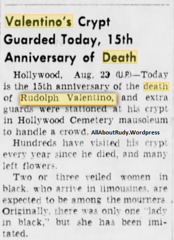 A movement is being launched in Hollywood to erect a new memorial to Rudolph Valentino. It will take the form of a sarcophagus mausoleum in which Valentino is to be entombed. According to current plans, the building will cost around $40,000. The chap who imparted this information to me did not know whether a fund existed to erect the mausoleum or whether the money would be obtained by popular subscription. A difference of opinion arose regarding the latter course of procedure. It was my contention that some difficulties would be encountered unless large individual amounts were subscribed. After all, Valentino has been dead 5 years and these are times of stringent financial difficulties. “Forty thousand is a mere drop in the bucket”, my friend informed me. “Four hundred thousand could be raised in a short time if necessary”. Quite apparently you haven’t followed the legend of Valentino. Even in death he remains the screen’s most popular male star. The idolatry accorded Garbo is the only approach to the tremendous tradition of Valentino. “Pilgrimages to his grave rival those of history. Five years? What are five years? It will take a generation to dim his shining star and at least another generation to eclipse it even partially. If the people behind the memorial ask the public to subscribe, they can have the money almost over-night. “Do you know that there are nearly a score of Valentino Associations whose memberships are pledged to keep his crypt ever beautiful with flowers? Do you know that no less than ten people daily appear at the offices of the Hollywood Cemetery to inquire specifically where they might find the Valentino burial place? These folks are the new pilgrims and their number multiplied many times by the regulars. Five years and don’t talk to me about five years. Go talk to Pete at the mausoleum. He will give you a story of the Valentino’s tradition that will, if I am not mistaken amaze you. It seemed like good advice. I found that Pete was the diminutive of Roger Peterson, a big blond Scandinavian from Minnesota. He is the attendant at the Hollywood Cemetery mausoleum where Valentino is buried. In many respects Pete belies the conception of what a cemetery attendant should be. He is not a taciturn unsmiling individual but rather a loquacious, pleasant chap as jovial as he is big. Very frankly, Pete was a revelation to me. The major part of his duties have to do with inquiries concerning Valentino. It is therefore, an authority on the film star. Visitors, genuinely interested in Valentino and they number thousands find Pete a sympathetic confidant. Unfortunately, he also has to deal with hysterical, sometimes unbalanced people who make a Roman holiday of their visits to Valentino’s crypt. His handling of each semi-psychopathic cases would do credit to a physician. Pete has kept a diary since he has been on the job at Hollywood Cemetery. Like all diary-keepers, he has not made entries every day. There are long stretches of blank pages when the diary was forgotten in the press of other duties or pleasures. Not all the dates are accurate to the exact day. Pete was careless about dates. The document, nonetheless, presents an intensely vivid picture which I have taken but few liberties in transcribing. There are several points of Pete’s story to which I have added facts. The reporting of contacts with individuals, however, is entirely his own. The first date that concerns us is;