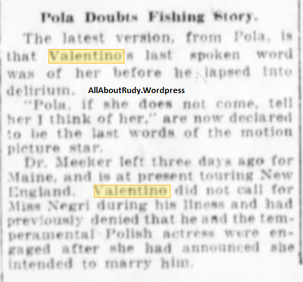 Arthur Brisbane in his column today, in the American says “Millions all over the world as far as moving pictures spread learn with deep regret of the death of Rudolph Valentino who had made so important a place for himself in a great art. A very young man with intense feeling and earnestness Valentino held his place without a rival in the field. His life was too short but it was not wasted”..