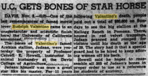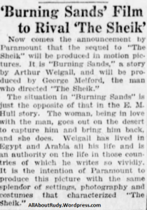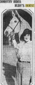 Rudolph Valentino’s famous horse that he rode in his movie “The Sheik” was picked as Dorothy Dwan’s mount in the Los Angeles Horse Show parade. Miss Dwan is an expert horsewoman having been leading lady with Tom Mix, the cowboy star for two years.