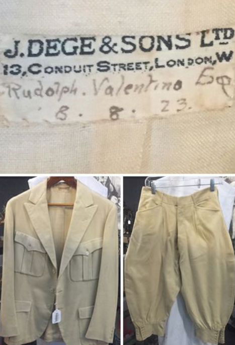 Rudolph Valentino was a stylish man about town who enjoyed his movie star success and living the American dream. It is well documented he enjoyed the finer things in life that his hard-earned salary could buy. The newspapers would write articles dedicated to Rudolph Valentino about how immaculately well-dressed he was. Rudy would often travel to Europe to purchase antiques, fine art and clothes. One of his favorite destinations was London specifically to buy specifically tailored suits and his go to store for most of his suits was J. Dege & Sons, LTD, London. This company is world famous for its military tailoring and every suit is made by hand. Founded in 1865, Arthur Dege initially operated a tailoring business at 13 Conduit Street, known as J. Dege & Sons. The original owners Arthur Dege and William Skinner met at merchant Taylor’s school in 1880. Before setting up shop together at the turn of 20th Century as Dege & Skinner. In 1912, tragedy struck when William Skinner died in a riding accident. Jacob Dege who was the son of Arthur Dege was forced to resign because of anti-german sentiment from WWI. Tim Skinner who was the son of William Skinner was placed in charge of the company. Last year, Bonhams, New York held an auction called Lights, Camera, Auction. One of Rudolph Valentino’s suits a cream wool made at the companies location at 13 Conduit Street bought during his honeymoon in 1923 was sold at the auction for $20,000. J.Dege still exists today as one of the premier tailors on Savile Row, London.