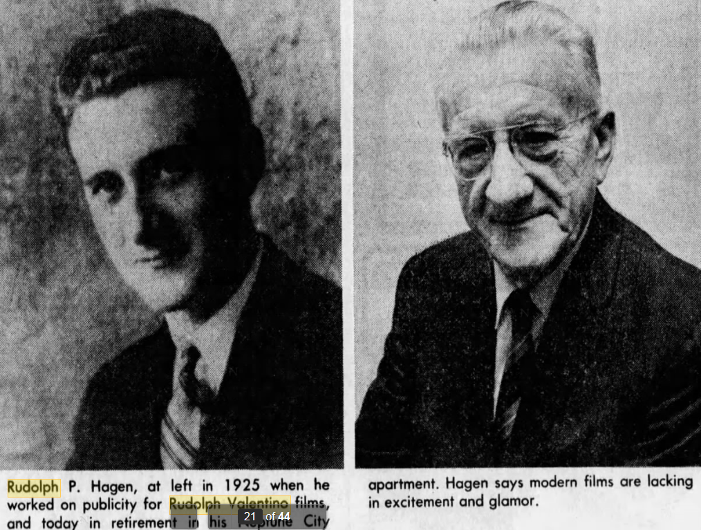 If you happen to possess a “personally autographed” photo of screen actor Rudolph Valentino, chances are that it was actually signed by another Rudolph. Rudolph Hagen, Neptune City who is now 75 spent nearly 40 years in the motion picture industry, behind the scenes in production and distribution of silent and sound movies. In 1925, Hagen was in charge of accounting for Ritz Carlton Pictures in Hollywood was temporarily recruited to sign several hundred photographs of Valentino to fill the requests by his adoring fans. “I studied Valentino’s signature and remember that it was very unique with the letters d and a being different. After some practice, I was able to duplicate it almost exactly” he recalled. Valentino was under contract with Ritz Carlton at the time starring in its first production “Cobra” with Nita Naldi, a well-known vamp of the day. Mr. Hagen saw a great deal of Valentino at the studio and was impressed by his friendly manner. “He was very nice to everyone and very much the gentleman. He spoke with a slight Italian accent which women found charming” Mr. Hagen explained. Throughout the four months it took to film “Cobra”. Hagen remembers, Valentino followed a strict program of exercise. “Valentino had a very trim athletic physique which he maintained through a vigorous exercise regimen. He encouraged all of us at the studio to exercise to keep fit. He was an excellent dancer and horseman as well. At the age of 30, Valentino appeared to be in the best of health. Following completion of “Cobra” Valentino was to star in “The Hooded Falcon” for Ritz Carlton a film written by his controversial wife Natacha Rambova. “We obtain a vicious wild falcon for the movie and had to hire a bird trainer to care for it. The studio spent approximately $50,000 in preparation for production”. Because of the constant demands and interference on the part of Valentino’s wife who wanted control over every phase of production, and the projected $900,000 cost of the film, “The Hooded Falcon” never materialized. Following the cancellation of Valentino’s contract. It was Hagens responsibility to tie-up the loose ends of the production giving the studio staff its final paychecks, taking inventory of the wardrobe, and returning all props, including the wild falcon. “Cobra” was Valentino’s last completed picture for the studio. He died suddenly in 1926. “It was sadly ironic that a man who was so devoted to physical fitness should die at such an early age. His life style was incredibly luxurious with rich food and drink every day. He crowded 70 years of living into a mere 36”. After the bankruptcy of Ritz Carlton, Hagen declined an offer from studio boss J.D. Williams to join him in England where he was starting a new production company, British National Pictures. However, Williams gave him letters of introduction to several motion picture executives. One letter led to Harry Warner, President of Warner Bros. who offered him a job that was to last 32 years. In the same year, Hagen met his first wife Irene Hussey whom he married in 1927. Hagen’s rise in the motion picture industry was a far cry from his humble beginnings when his first job in 1928 was in bookkeeping for First National Pictures, which distributed silent films. There he became associated with one of the founders at First National and later Ritz Carlton. When asked to assess the changes in movies over the years Hagen said “I miss the glamour of the old films they had star value. I’m nostalgic for the movies of Rudolph Valentino, James Cagney, Barrymore etc. They lack the important ingredient and that is star quality.