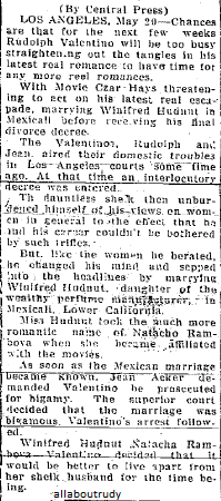 The names of five witnesses, whose testimony is believed “of great value” were obtained today at Indio, Cal., by Los Angeles detectives who are investigating in Mexican border towns, both above and below the line, the recent marriage at Mexicali, Lower California, of Rudolph Valentino, film actor and Winifred Hudnut, a motion picture art director, known professionally as Natacha Rambova. A telegram containing that declaration was received from the detective tonight by Tom McClelland, deputy district attorney, who is assisting Thomas Lee Woolwine, district attorney, in an inquiry designed to determine whether Valentino committed bigamy in remarrying before the interlocutory decree of divorce he received here January 10, last, from Jean Acker, screen actress, became final, WOULD BLOCK PROBE. McClelland also stated he had received a visit today from representatives of “motion picture Interests” who had attempted to discourage the investigation. He quoted them as saying: “There is much money involved. It will be a very disastrous enterprise to the industry if the Valentino case is prosecuted.” lie said he replied. “When you find damaged goods, you must take the hazard of the gain.” ,He declined to name his visitors. He said they made no “threats. ’ but rather a “plea’ because of the financial value of Valentino’s contracts and the probable effect of prosecution on the “box office.’’ McClelland said that W. I. Gilbert, attorney for A alentino, had notified him that the a<tor was ready to go to the district attorney’s office whenever desired. Miss Acker, late today, made an appointment to go to that office tomorrow morning to make a statement in connection with the case. It was also announced by McClelland that an investigation of the divorce and re-marriage of Henry B. Walthall, also a motion picture actor, had established to his satisfaction that the proceedings were absolutely legal. He said he was still investigating u report that Frank Mayo, another film player, re-married at Tijuana. Lower California, on October 2 last, four days after an interlocutory decree of divorce from his first wife was granted here. The May investigation of the alleged visit to El Centro of Rodolph Valentino, film actor, and his bride, Winifred Hudnut, before their marriage in Mexicali, lower California, last Saturday, was begun here today by E. R. Simon, district attorney of imperial county, at the request of Thomas Lee Wnolvvine. district attorney of Los Angeles county. Valentino and Miss Hudnut are said to have passed Thursday and Friday of last week in El Centro. This and the arrangements made for the wedding at Mexicali, in Mexico, 12 miles south of El Centro, are being investigated, Simon stated. adding that he hoped to report to WoolwiIne not later than next Monday. Two detectives sent from the office of Woolwine conferred today with Simon