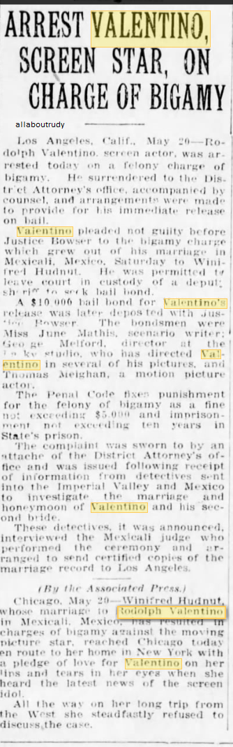 The names of five witnesses, whose testimony is believed “of great value” were obtained today at Indio, Cal., by Los Angeles detectives who are investigating in Mexican border towns, both above and below the line, the recent marriage at Mexicali, Lower California, of Rudolph Valentino, film actor and Winifred Hudnut, a motion picture art director, known professionally as Natacha Rambova. A telegram containing that declaration was received from the detective tonight by Tom McClelland, deputy district attorney, who is assisting Thomas Lee Woolwine, district attorney, in an inquiry designed to determine whether Valentino committed bigamy in remarrying before the interlocutory decree of divorce he received here January 10, last, from Jean Acker, screen actress, became final, WOULD BLOCK PROBE. McClelland also stated he had received a visit today from representatives of “motion picture Interests” who had attempted to discourage the investigation. He quoted them as saying: “There is much money involved. It will be a very disastrous enterprise to the industry if the Valentino case is prosecuted.” lie said he replied. “When you find damaged goods, you must take the hazard of the gain.” ,He declined to name his visitors. He said they made no “threats. ’ but rather a “plea’ because of the financial value of Valentino’s contracts and the probable effect of prosecution on the “box office.’’ McClelland said that W. I. Gilbert, attorney for A alentino, had notified him that the a<tor was ready to go to the district attorney’s office whenever desired. Miss Acker, late today, made an appointment to go to that office tomorrow morning to make a statement in connection with the case. It was also announced by McClelland that an investigation of the divorce and re-marriage of Henry B. Walthall, also a motion picture actor, had established to his satisfaction that the proceedings were absolutely legal. He said he was still investigating u report that Frank Mayo, another film player, re-married at Tijuana. Lower California, on October 2 last, four days after an interlocutory decree of divorce from his first wife was granted here. The May investigation of the alleged visit to El Centro of Rodolph Valentino, film actor, and his bride, Winifred Hudnut, before their marriage in Mexicali, lower California, last Saturday, was begun here today by E. R. Simon, district attorney of imperial county, at the request of Thomas Lee Wnolvvine. district attorney of Los Angeles county. Valentino and Miss Hudnut are said to have passed Thursday and Friday of last week in El Centro. This and the arrangements made for the wedding at Mexicali, in Mexico, 12 miles south of El Centro, are being investigated, Simon stated. adding that he hoped to report to WoolwiIne not later than next Monday. Two detectives sent from the office of Woolwine conferred today with Simon