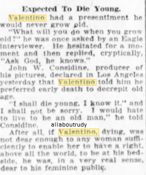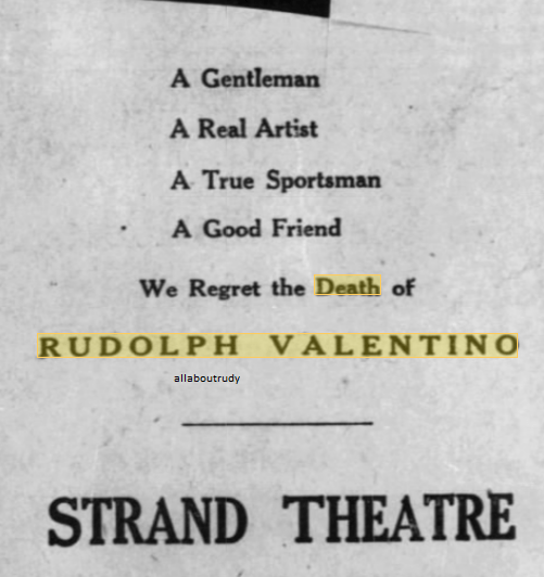 Several readers have complained because the newspapers devoted more space to the death of Rudolph Valentino. An editor is not a historian who seeks to put happenings into their proper perspective. If the great preoccupation of the public with Valentino is a thing to evaporate in a short time, that is more reason why it becomes news today. It is well to remember also that the story of Valentino’s death is not concerned alone with the individual in question but with the reaction of the public to this event. When thousands stand in the rain for hours seeking a chance to pass the dead man’s bier, that is news beyond any question. It does not matter that many of the people in line were morbid curiosity seekers. The precise extend of morbidity is also a proper subject of journalistic concern. I rather think that some reports have been too severe in judging the motives of the crowd. I saw long lines at a distance in the dripping rain, and it is my belief that if it had been possible for a reporter to investigate the hearts of all who waiting there he would have found in many who trudged the slow march through the doors a profound emotion. Valentino had become that priceless thing – a symbol. It was not so much a motion picture actor who lay dead as Pan of Apollo whom they are to bury from Campbell’s funeral parlor. He was to the thousands the romance which they never knew. He was Prince Charming and came from the other side of the moon. And if a symbol of romance in the lives of many millions fades, that is a not undignified matter of newspaper interest. It is a long sleep to which Valentino has gone, and soon the thousands will have another symbol to take his place. It seems to me a little cruel to deny a dead actor his last full measure of press clippings.
