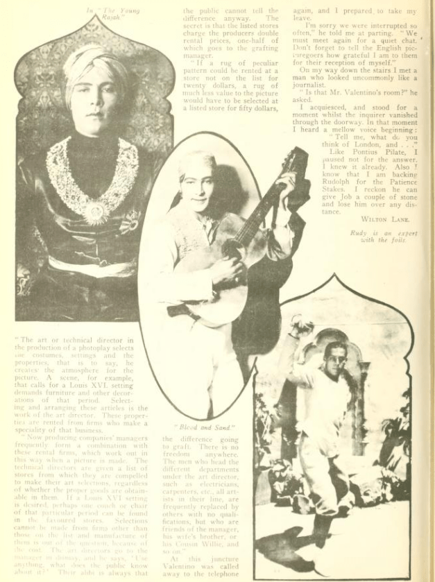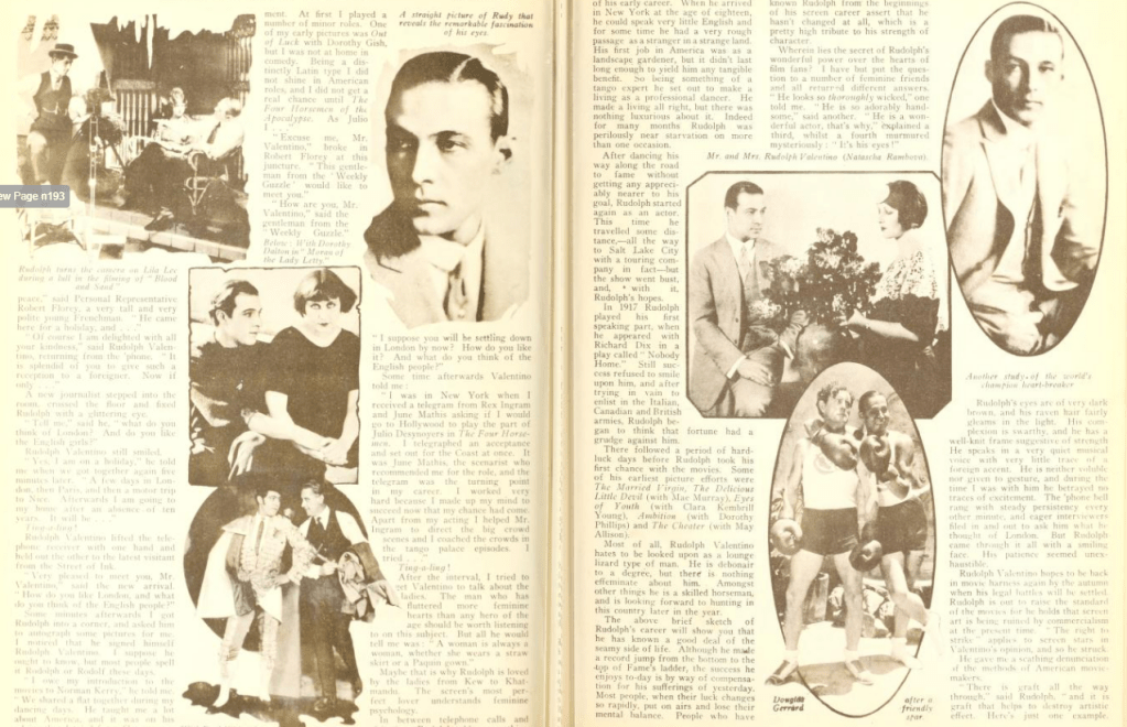 This is not an answer to the question “why do girls leave home,” but an attempt to analyse Rudolph Valentino, the screen’s most popular lover. This London interview with the beloved Rudolph gives you an unconventional pen-picture of the man whose charm has been described as “irresistible” by feminine picturegoers all the world over. Once upon a time there was a man named Job who had a pretty rough passage through this vale of tears. Job, as you remember, was a patient man. Sarcastic women will tell you that he is the _only_ patient man in the history of the world. I disagree. In my time I have met a large number of patient men, but without any hesitation I award the palm of patience to a man I met to-day. His name is Rudolph Valentino.When a celebrity comes to London, journalists foregather in his vicinity like flies round a honeypot. If he is good “copy,” he has to stand and deliver. There is no escape. Clever people can dodge bloodhounds and it is possible to deceive a police officer; but the copy-hound will get you every time. In a reception room on the first floor at the Carlton I found Rudolph Valentino entirely surrounded by copy-hounds. I recognised the old familiar bark: “And what do you think of England and the English people?” before the door opened to admit me into the presence of the man who rules the raves. A moment later I was shaking hands with a dark man of strikingly handsome aspect, who wore a magnificent dressing-gown over purple pyjamas, and sported rings on his fingers and red Russian-leather slippers on his toes. There is no denying that the man is devilish good looking, but if he carries the conceit that usually goes with good looks he dissembles very cleverly. For he is quiet and shy and sensible with not so much as a ha’porth of side about him. Also, as you shall learn hereafter, he is about the most patient thing that ever happened. For three days and three nights life for Valentino had been one question after another. Yet when I met him on the fourth day of his visit he was as bland and smiling as the man who says, “Yes, we have no bananas.” But the burden of Rudolph’s song was, “No, I can’t tell you anything about London. I haven’t seen it yet.”Then where _have_ you been?” I inquired. “Here,” said Rudolph Valentino. “Here in this hotel answering questions. And the telephone. And letters. I’ve had to engage a secretary to look after the correspondence. See that pile there? Girls write and say: “Please may I see you and bring your mother and father. Now what.”Ting-a-ling! He hasn’t had a minute’s peace, said Personal Representative Robert Florey, a very tall and very polite young Frenchman. “He came here for a holiday, and “Of course I am delighted with all your kindness, ” said Rudolph Valentino, returning from the ‘phone. “It is splendid of you to give such a reception to a foreigner. Now if only.”A new journalist stepped into the room, crossed the floor and fixed Rudolph with a glittering eye. “Tell me,”said he, “what do you think of London? And do you like the English girls?” Rudolph Valentino still smiled. “Yes, I am on a holiday,” he told me when we got together again five minutes later. “A few days in London, then Paris, and then a motor trip to Nice. Afterwards I am going to my home after an absence of ten years. It will be.”Ting-a-ling! Rudolph Valentino lifted the telephone receiver with one hand and held out the other to the latest visitant from the Street of Ink. “Very pleased to meet you, Mr. Valentino,” said the new arrival. “How do you like London, and what do you think of the English people?” Some minutes afterwards I got Rudolph into a corner and asked him to autograph some pictures for me. I noticed that he signed himself Rudolph Valentino. I suppose he ought to know, but most people spell it Rodolph or Rodolf these days.”I owe my introduction to the movies to Norman Kerry,” he told me. “We shared a flat together during my dancing days. He taught me a lot about America, and it was on his advice that I tried for a film engagement. At first, I played a number of minor roles. One of my early pictures was “Out of Luck” with Dorothy Gish, but I was not at home in comedy. Being a distinct Latin type I did not shine in American roles, and I did not get a real chance until “The Four Horsemen of the Apocalypse.” As Julio I “Excuse me, Mr. Valentino,” broke in Robert Florey at this juncture. “This gentleman from the ‘Weekly Guzzle’ would like to meet you. “How are you, Mr. Valentino?” said the gentleman from the “Weekly Guzzle.” “I suppose you will be settling down in London by now. How do you like it and what do you think of the English people?” Sometime afterwards Valentino told me: “I was in New York when I received a telegram from Rex Ingram and June Mathis asking if I would go to Hollywood to play the part of Julio Desnoyers in “The Four Horsemen.” I telegraphed an acceptance and set out for the Coast at once. It was June Mathis, the scenarist who recommended me for the role, and the telegram was the turning point in my career. I worked very hard because I made up my mind to succeed now that my chance had come. Apart from my acting I helped Mr. Ingram to direct the big crowd scenes and I coached the crowds in the tango palace episodes. I tried “Ting-a-ling! After the interval, I tried to get Valentino to talk about the ladies. The man who has fluttered more feminine hearts than any hero of the age should be worth listening to on this subject. But all he would tell me was: “A woman is always a woman, whether she wears a straw skirt or a Paquin gown.” Maybe that is why Rudolph is loved by the ladies from Kew to Khatmandu. The screen’s most perfect lover understands feminine psychology. In between telephone calls and visitations, Rudolph told me something of his early career. When he arrived in New York at the age of