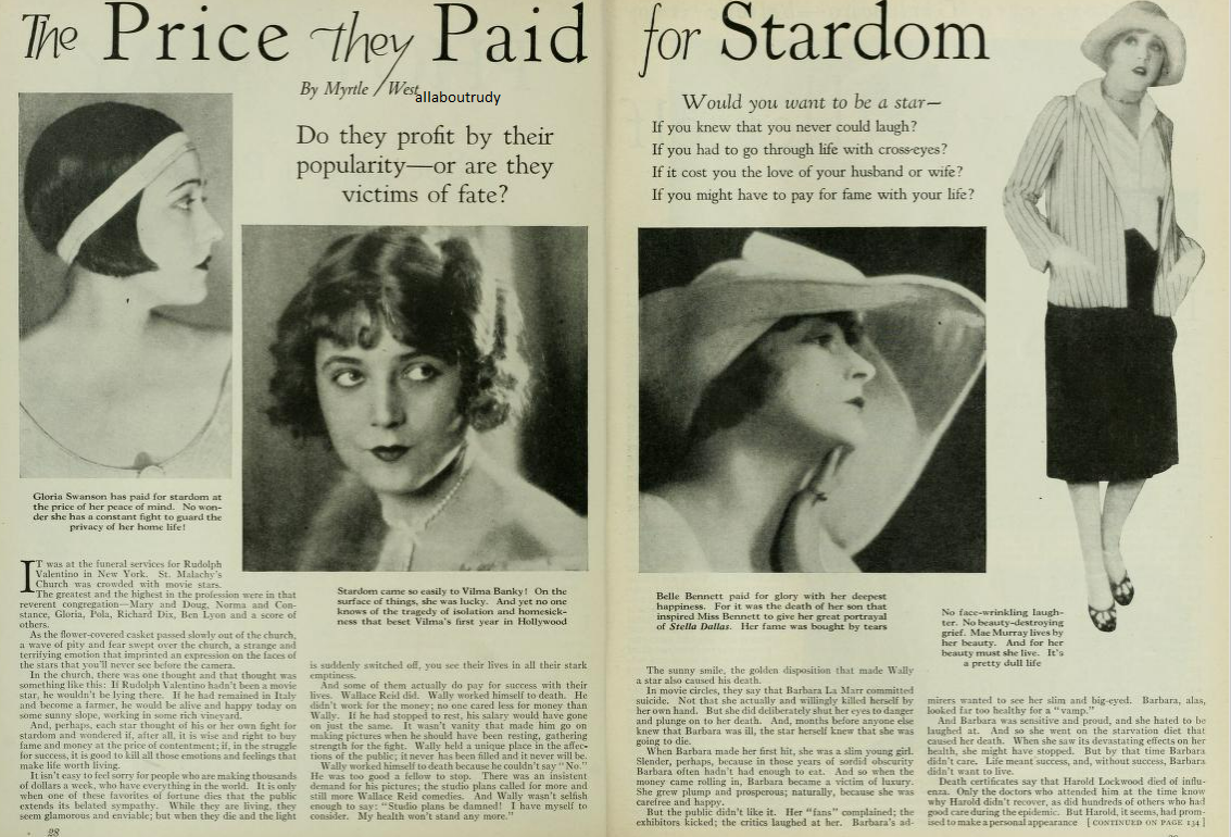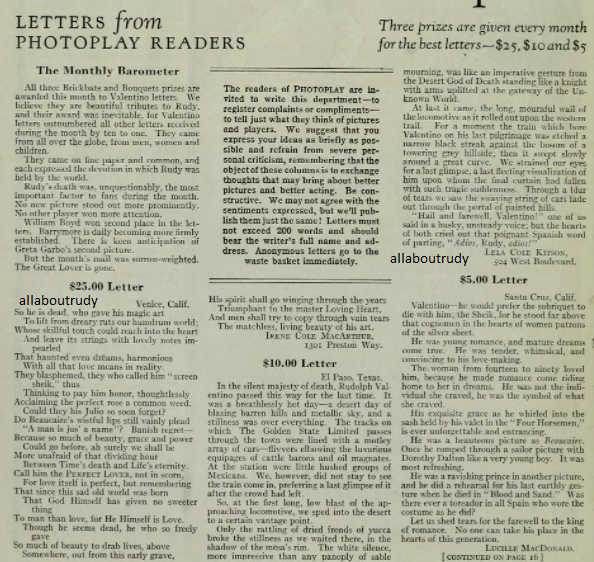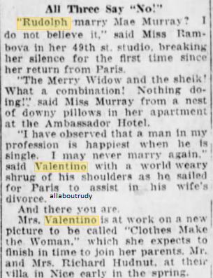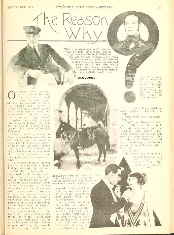 This is not an answer to the question “why do girls leave home,” but an attempt to analyse Rudolph Valentino, the screen’s most popular lover. This London interview with the beloved Rudolph gives you an unconventional pen-picture of the man whose charm has been described as “irresistible” by feminine picturegoers all the world over. Once upon a time there was a man named Job who had a pretty rough passage through this vale of tears. Job, as you remember, was a patient man. Sarcastic women will tell you that he is the _only_ patient man in the history of the world. I disagree. In my time I have met a large number of patient men, but without any hesitation I award the palm of patience to a man I met to-day. His name is Rudolph Valentino.When a celebrity comes to London, journalists foregather in his vicinity like flies round a honeypot. If he is good “copy,” he has to stand and deliver. There is no escape. Clever people can dodge bloodhounds and it is possible to deceive a police officer; but the copy-hound will get you every time. In a reception room on the first floor at the Carlton I found Rudolph Valentino entirely surrounded by copy-hounds. I recognised the old familiar bark: “And what do you think of England and the English people?” before the door opened to admit me into the presence of the man who rules the raves. A moment later I was shaking hands with a dark man of strikingly handsome aspect, who wore a magnificent dressing-gown over purple pyjamas, and sported rings on his fingers and red Russian-leather slippers on his toes. There is no denying that the man is devilish good looking, but if he carries the conceit that usually goes with good looks he dissembles very cleverly. For he is quiet and shy and sensible with not so much as a ha’porth of side about him. Also, as you shall learn hereafter, he is about the most patient thing that ever happened. For three days and three nights life for Valentino had been one question after another. Yet when I met him on the fourth day of his visit he was as bland and smiling as the man who says, “Yes, we have no bananas.” But the burden of Rudolph’s song was, “No, I can’t tell you anything about London. I haven’t seen it yet.”Then where _have_ you been?” I inquired. “Here,” said Rudolph Valentino. “Here in this hotel answering questions. And the telephone. And letters. I’ve had to engage a secretary to look after the correspondence. See that pile there? Girls write and say: “Please may I see you and bring your mother and father. Now what.”Ting-a-ling! He hasn’t had a minute’s peace, said Personal Representative Robert Florey, a very tall and very polite young Frenchman. “He came here for a holiday, and “Of course I am delighted with all your kindness, ” said Rudolph Valentino, returning from the ‘phone. “It is splendid of you to give such a reception to a foreigner. Now if only.”A new journalist stepped into the room, crossed the floor and fixed Rudolph with a glittering eye. “Tell me,”said he, “what do you think of London? And do you like the English girls?” Rudolph Valentino still smiled. “Yes, I am on a holiday,” he told me when we got together again five minutes later. “A few days in London, then Paris, and then a motor trip to Nice. Afterwards I am going to my home after an absence of ten years. It will be.”Ting-a-ling! Rudolph Valentino lifted the telephone receiver with one hand and held out the other to the latest visitant from the Street of Ink. “Very pleased to meet you, Mr. Valentino,” said the new arrival. “How do you like London, and what do you think of the English people?” Some minutes afterwards I got Rudolph into a corner and asked him to autograph some pictures for me. I noticed that he signed himself Rudolph Valentino. I suppose he ought to know, but most people spell it Rodolph or Rodolf these days.”I owe my introduction to the movies to Norman Kerry,” he told me. “We shared a flat together during my dancing days. He taught me a lot about America, and it was on his advice that I tried for a film engagement. At first, I played a number of minor roles. One of my early pictures was “Out of Luck” with Dorothy Gish, but I was not at home in comedy. Being a distinct Latin type I did not shine in American roles, and I did not get a real chance until “The Four Horsemen of the Apocalypse.” As Julio I “Excuse me, Mr. Valentino,” broke in Robert Florey at this juncture. “This gentleman from the ‘Weekly Guzzle’ would like to meet you. “How are you, Mr. Valentino?” said the gentleman from the “Weekly Guzzle.” “I suppose you will be settling down in London by now. How do you like it and what do you think of the English people?” Sometime afterwards Valentino told me: “I was in New York when I received a telegram from Rex Ingram and June Mathis asking if I would go to Hollywood to play the part of Julio Desnoyers in “The Four Horsemen.” I telegraphed an acceptance and set out for the Coast at once. It was June Mathis, the scenarist who recommended me for the role, and the telegram was the turning point in my career. I worked very hard because I made up my mind to succeed now that my chance had come. Apart from my acting I helped Mr. Ingram to direct the big crowd scenes and I coached the crowds in the tango palace episodes. I tried “Ting-a-ling! After the interval, I tried to get Valentino to talk about the ladies. The man who has fluttered more feminine hearts than any hero of the age should be worth listening to on this subject. But all he would tell me was: “A woman is always a woman, whether she wears a straw skirt or a Paquin gown.” Maybe that is why Rudolph is loved by the ladies from Kew to Khatmandu. The screen’s most perfect lover understands feminine psychology. In between telephone calls and visitations, Rudolph told me something of his early career. When he arrived in New York at the age of