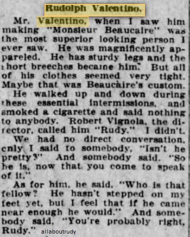 Millions all over the world as far as moving pictures learned with deep regret his passing. A very young man of intense feeling and earnestness, Rudy held his place, without a noted rival in his field. He came to this melting pot country seeking a better way of life. While his early struggles were known he made his way by hard work and talent that showed the world on the silver screen just how remarkable he truly is. Life on this mortal earth was brief but it was not wasted.