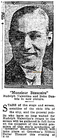 This is not an answer to the question “why do girls leave home,” but an attempt to analyse Rudolph Valentino, the screen’s most popular lover. This London interview, with the beloved Rudolph gives you an unconventional pen-picture of the man whose charm has been described as “irresistible” by feminine picturegoers all the world over. Once upon a time there was a man named Job who had a pretty rough passage through this vale of tears. Job, as you remember, was a patient man. Sarcastic women will tell you that he is the only patient man in the history of the world. I disagree. In my time I have met a large number of patient men, but without any hesitation I award the palm of patience to a man I met to-day. His name is Rudolph Valentino. When a celebrity comes to London, journalists foregather in his vicinity like flies round a honeypot. If he is good “copy,” he has to stand and deliver. There is no escape. Clever people can dodge bloodhounds and it is possible to deceive a policeman; but the copy-hound will get you every time. In a reception room on the first floor at the Carlton Hotel, Rudolph Valentino entirely surrounded by copy-hounds. I recognised the old familiar bark: “And what do you think of England and the English people?” before the door opened to admit me into the presence of the man who rules the raves. A moment later I was shaking hands with a dark man of strikingly handsome aspect, who wore a magnificent dressing-gown over purple pyjamas, and sported rings on his fingers and red Russian-leather slippers on his toes. There is no denying that the man is devilish good looking, but if he carries the conceit that usually goes with good looks he dissembles very cleverly. For he is quiet and shy and sensible and as you shall learn hereafter, he is about the most patient thing that ever happened. For three days and nights life for Valentino had been one question after another. Yet when I met him on the fourth day of his visit he was as bland and smiling as the man who says, “Yes, we have no bananas.” But the burden of Rudolph’s song was, “No, I can’t tell you anything about London. I haven’t seen it yet and then where have you been” I inquired. “Here,” said Rudolph Valentino. “Here in this hotel answering questions, the telephone, or letters. I have had to engage a secretary to assist with the correspondence it is more than one person can handle. See that pile there? Girls write and say: “Please may I come and see you and bring mother and father. Now what “Ting-a-ling! “He hasn’t had a minute’s peace, said Personal Representative Robert Florey, a very tall and very polite young Frenchman. “He came here for a holiday, and “Of course, I am delighted with all your kindness, ” said Rudolph Valentino, returning from the phone. “It is splendid of you to give such a reception to a foreigner. Now if only A new journalist stepped into the room, crossed the floor and fixed Rudolph with a glittering eye. Tell me, “What do you think of London? And do you like the English girls?” Rudolph Valentino still smiled. “Yes, I am on a holiday,” he told me when we got together again five minutes later. “A few days in London, then Paris, and then a motor trip to Nice. Afterwards I am going to my home after an absence of ten years. It will be Ting-a-ling! Rudolph Valentino lifted the telephone receiver with one hand and held out the other to the latest visitant from the Street of Ink. “Very pleased to meet you, Mr. Valentino,” said the new arrival. “How do you like London, and what do you think of the English people?” Some minutes afterwards I got Rudolph into a corner and asked him to autograph some pictures for me. I noticed that he signed himself Rudolph Valentino. I suppose he ought to know, but most people spell its Rodolph or Rodolf these days. “I owe my introduction to the movies to Norman Kerry,” he told me. We shared a flat together during my dancing days. He taught me a lot about America, and it was on his advice that I tried for a film engagement. At first, I played a number of minor roles. One of my early pictures were “Out of Luck” with Dorothy Gish, but I was not at home in comedy. Being a distinct Latin type I did not shine in American roles, and I did not get a real chance until “The Four Horsemen of the Apocalypse.” As Julio I “Excuse me, Mr. Valentino,” broke in Robert Florey at this juncture. “This gentleman from the ‘Weekly Guzzle’ would like to meet you.” How are you, Mr. Valentino?” said the gentleman from the “Weekly Guzzle.” “I suppose you will be settling down in London by now. How do you like it? And what do you think of the English people?” Sometime afterwards Valentino told me: “I was in New York when I received a telegram from Rex Ingram and June Mathis asking if I would go to Hollywood to play the part of Julio Desnoyers in “The Four Horsemen.” I telegraphed an acceptance and set out for the Coast at once. It was June Mathis, the scenarist who recommended me for the role, and the telegram was the turning point in my career. I worked very hard because I made up my mind to succeed now that my chance had come. Apart from my acting I helped Mr. Ingram to direct the big crowd scenes and I coached the crowds in the tango palace episodes. I tried . . .”Ting-a-ling! After the interval, I tried to get Valentino to talk about the ladies. The man who has fluttered more feminine hearts than any hero of the age should be worth listening to on this subject. But all he would tell me was: “A woman is always a woman, whether she wears a straw skirt or a Paquin gown. “Maybe that is why Rudolph is loved by the ladies from Kew to Katmandu. The screen’s most perfect lover understands feminine psychology. In between telephone calls and visitations, Rudolph told me something of his early career. When he arrived in New York at the age of eighteen, he could speak very little Englis