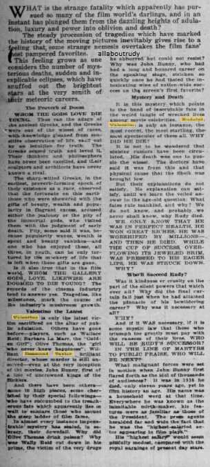 The movies leading star, Rudolph Valentino became a household name. To women the world over he became “a romantic symbol of the modern age”. Famous Players- Lasky realized the silent movie idol’s appeal to women and immediately capitalized on the frantic publicity. Valentino was a former paid dance companion and exhibition dancer. “The Four Horsemen of the Apocalypse” has different dance scenes that capitalize on the social repercussions when two people dance suggestively. The New York World Newspaper’s movie review wrote that Valentino was well chosen for his leading role. The part calls for an adept dancer of the Argentine tango and he was the type needed for the part. The film was a complex family centered narrative with amazing special effects. The box office advertising you cannot have known how the tango can be danced until you see “The Four Horseman of the Apocalypse”. When Valentino appears in his first movie scene dressed in a gaucho outfit puffing on a cigarette while he stares suggestively at a female dance in a Buenos Aires Dance Hall, this stirs the imaginations of woman movie goers. Then Valentino glides with his partner across the dance floor in the sensuous moves of the tango but the effect is amazing. Julio his male beauty and sex appeal showing his dance partner he is the master of her body in the tango’s controversial hot hip contact. A master of seduction he moves on to his next conquest Marguerite Laurier, an attractive married woman. Their affair starts in a Parisian tango palace and on the dance floor he impresses her with his charm and grace. Then on to his art studio, Julio crushes his lover in a romantic embrace and his hands are all over her body in places one would not normally see on a movie screen. Alas all good things must come to an end and the affair is discovered and Julio must atone for his sexual transgressions. The start of WWI, Julio realizes his love for Marguerite, but he has a greater responsibility and a noble cause to his country. Julio dies on a muddy battlefield and both his family and lover mourn his loss. After this movie release, magazine articles were publishing articles about dancing with Valentino is an ultimate fantasy. For example, Movie Picture World Magazine article “When Valentino Taught Me to Dance” author Mary Winship gives a first-person account. She said “his arm supported me like a brace, I swum myself back, closed my eyes, breathed in the music and followed his movies. The music stopped, Valentino applauded and was so sweet. In 1922, Motion Picture Magazine, published an article “The Perfect Lover”, described Valentino as suave, debonair, with a glistening courtesy alien and disarming. After this article was published, he advised readers to “first dismiss the idea of me being sleek and elegant”. In the same year, another studio magazine Screenland talks about the problems with Valentino’s former profession. Valentino could make a good living as a dancer though he does not like it as a profession. His real qualifications as a landscaper are where he should earn his living. There is doubt whether he could earn a living outside of a studio or a dance hall. Valentino was woman made as a professional dancer since he partnered with already established female dancers. June Mathis described by fan magazines as a maker of young men was besieged by other young Valentino like men who constantly obtrude themselves into her home, imploring to be made with conscientiously amorous eyes. The role of dance in determining Valentino’s popularity was most forcefully illustrated when Valentino walked out on his contract with Famous Players-Lasky. In 1923, Valentino and his second wife Natacha Rambova, a trained ballet dancer, embarked on a successful dance exhibition tour under the sponsorship of Mineralava Beauty Company. In 1924 magazine poll, Valentino being named the fourth most popular dancer in the United States. Valentino’s legal problems with Famous Players Laskey were eventually resolved and he was able to go back to work. In 1925, two movies, “Cobra” and “Eagle” premiered, and Valentino’s moves are dance-like with refinement and grace. Both were not a box office success, but it still cemented his status as fan favorite. In January 1926, Valentino was interviewed for Collier’s Magazine. In the interview dance is portrayed as the last resort of an immigrant’s honest attempts to make a living. The star recounts falling back on his dance talents after he has pursued other jobs such as ‘”polishing brass, sweeping out stores, anything that will put a roof over my head and food in my stomach.” He is quoted as saying of his film career: “I wanted to make a lot of money, and so I let them play me up as a lounge lizard, a soft, handsome devil whose only aim in lite was to sit around and be admired by women. But at the same time, all I am a farmer at heart. In October 1926, The Dance Magazine, satirically declared Hollywood was the heaven of opportunity “where good dancers go when they die.”. Valentino’s sudden death of peritonitis five weeks before the magazine’s appearance demonstrated a deep if no doubt unintended irony in that statement. Death would not end the debate over Valentino’s symbolic place within the perceived crisis in American sexual and gender relation. Valentino, like dance, had become symbolic of social changes, taking place in the system governing American sexual relations in a post Victorian country. Valentino had confronted the country with other uncertainties as well. While some of these gender-based uncertainties converged with those offered by other matinee idols, such as John Barrymore, Valentino presented a higher order of problematics that circulated around the convergence of female fantasy with the dangerous, transformative possibilities of dance and with the highly restrictive norms