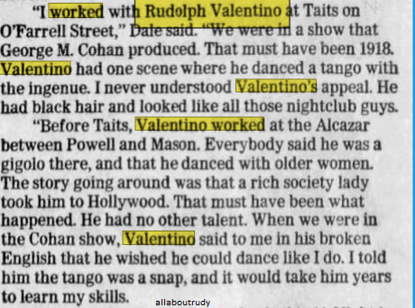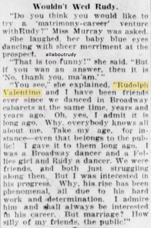 Natacha Rambova, former wife of Silent Film Star Rudolph Valentino died on 5 June 1966 in Pasadena, California. Today, her will went into probate in New York and her estate was valued at $367,000. Miss Rambova lived in New Milford Conneticut in her later years. However, her immediate family moved her out to California due to ill health. She was the adopted daughter of perfume mogul Richard Hudnut to whom her mother was married to. The will lists 25 specific bequests, left a $200 monthly lifetime pension to her half-sister Mrs. Mary Boyd, San Francisco and the balance of the estate went to 11 other relatives. One personal bequest left her entire library and collection of Tibetian and Nepalese Paintings and Bronzes to the Philadelphia Museum of Art.