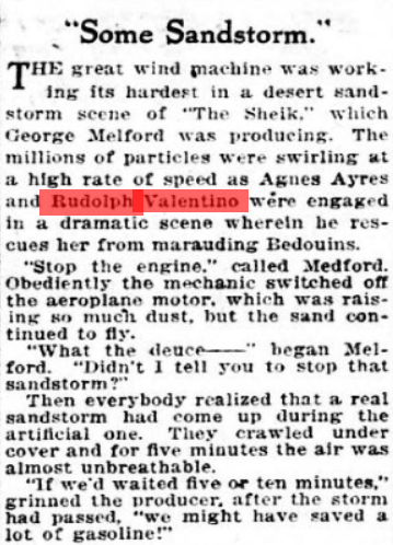 Rudolph Valentino, the Italian actor who played leading roles in Rex Ingram Productions for Metro “The Four Horsemen” and “Conquering Power” was being shown through the Italian gardens of a Hollywood hostess. “How charming” he exclaimed, with bubblinh Latin enthusiasm. “We have nothing like this in Italy”. Well of course you don’t