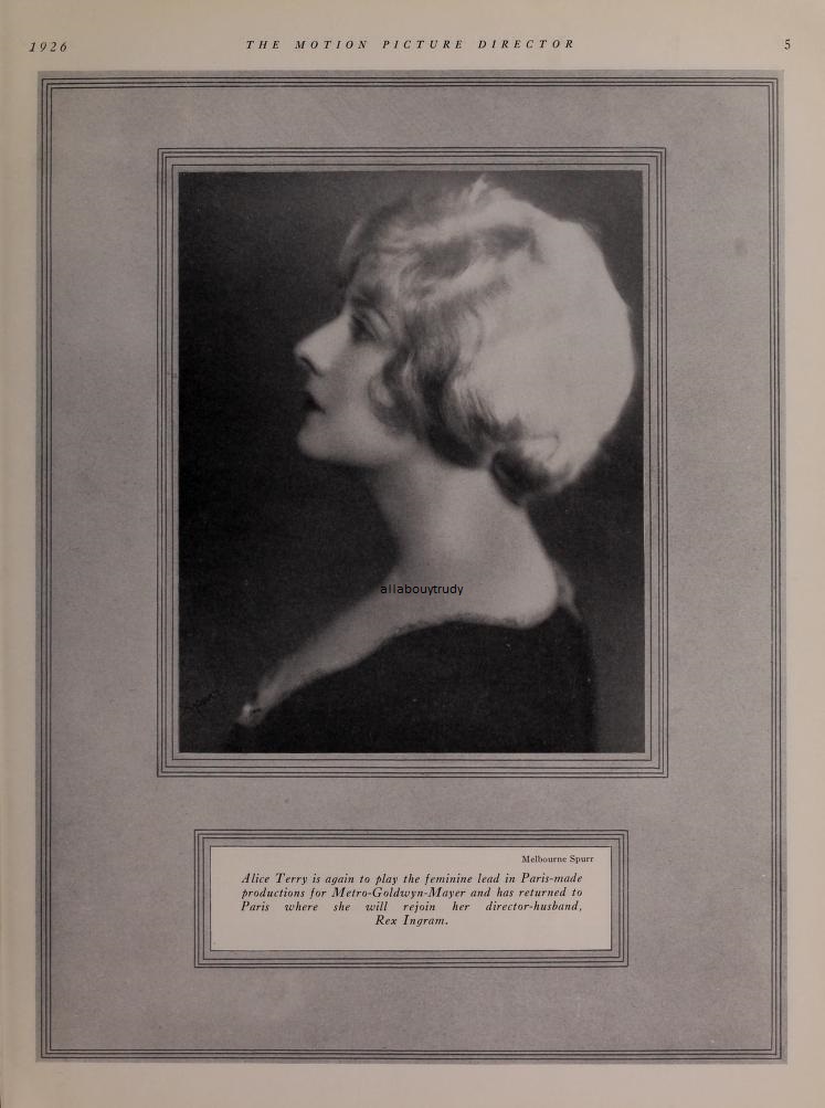 The story of Alice Terry has the same fairy tale quality as Valentino’s own. Like him, who had worked hard as an extra for many years and the hard work had resulted in little recognition. However, discouraging as had been her experience, it was not without results. For Rex Ingram happened to see her in NY when, as a girl, still in her mid-teens, she played with Bessie Barriscale in “Not My Little Sister”. The promise which she gave impressed the young director almost immediately. When indeed, he moved from NY to the coast, he welcomed the fact that she, too, had shifted from East to West. Had it not been for the war, in fact, Alice Terry would probably have been his leading lady some years before. When Ingram on his return from overseas service finally located the job which put a roof once more over his head and civilian clothes again upon his back, he was to resume his slight acquaintance with Miss Terry. For she came to his office then applied for a position as script girl, the functionary who, working on the set, chalks off the scenes as they are made and notes the new ones extemporized. He looked at her in amazement. “What”, cried he, “you don’t mean to say that you’ve given up acting do you?” She looked at him somewhat sadly, “Oh dear, yes,” she replied, “I did that sometime ago. It was too discouraging I wasn’t getting any place, you see. No matter how hard I worked nothing seemed to come of it. And of course being an extra or getting some bit now and then does not keep you. So I decided I’d just get a regular job.” “And what have you been doing since”? Inquired Ingram. “I’ve been working in the cutting room,” replied she, “and that was fine I mean it. Knowing just what you were going to get each week. But the ether commenced to get into my lungs that’s why I’m looking around for something else.” Ingram promised to give her the desired position in the picture following “Shore Acres”. However, something changed his plans and instead he case her for a wild and wooly Drury Lane melodrama called “Hearts are Trumps”. To his surprise she seemed loath to accept this chance of returning to the movie screen. “Oh no, I don’t want to try I’ve give it all up you see” she kept protesting in a way that showed how completely previous discouragements had shattered her self-confidence. But he finally succeeded in overcoming her fears, and since then she has been his leading lady in every story except “Piffling Women”. It was not, however, until the appearance of “The Four Horsemen” that Alice Terry, the girl who, heartsick from her discouragements on the set, had wanted to retire to the comparative obscurity of script work, won the wide recognition her beauty and her screen personality had so long deserved. All this I have just related I heard from Miss Terry now Mrs. Rex Ingram, on the same evening when Ingram told me of his experience working with Valentino. On this same occasion she and her husband mentioned that her next appearance will be in John Russell’s “Passion Vine”. In this her support will be Ramon Navarro, another dancer from whom Ingram predicts a success which may even duplicate that of Valentino. Both Valentino and Navarro, Ingram made an interesting observation. “A good dancer” he said, “frequently makes a good screen actor”. Why? Because he has both poise and repose, and I don’t know any better start than these. In this connection.