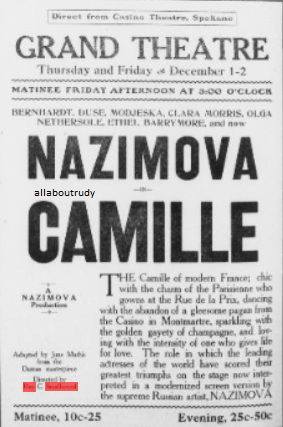 Mademosielle Natacha Rambova formerly a Russian Ballet Dancer although not a real Russian has forsaken the footlights to assist Nazimova in the designing of sets and costumes for her forthcoming productions which will include “Camille” and “Aphrodite” She was formerly with Theodore Kosloff as a dancer, designer and mistress and is employing bizarre and futuristic ideas in obtaining the effects which are necessary for Nazimova’s exotic personality.