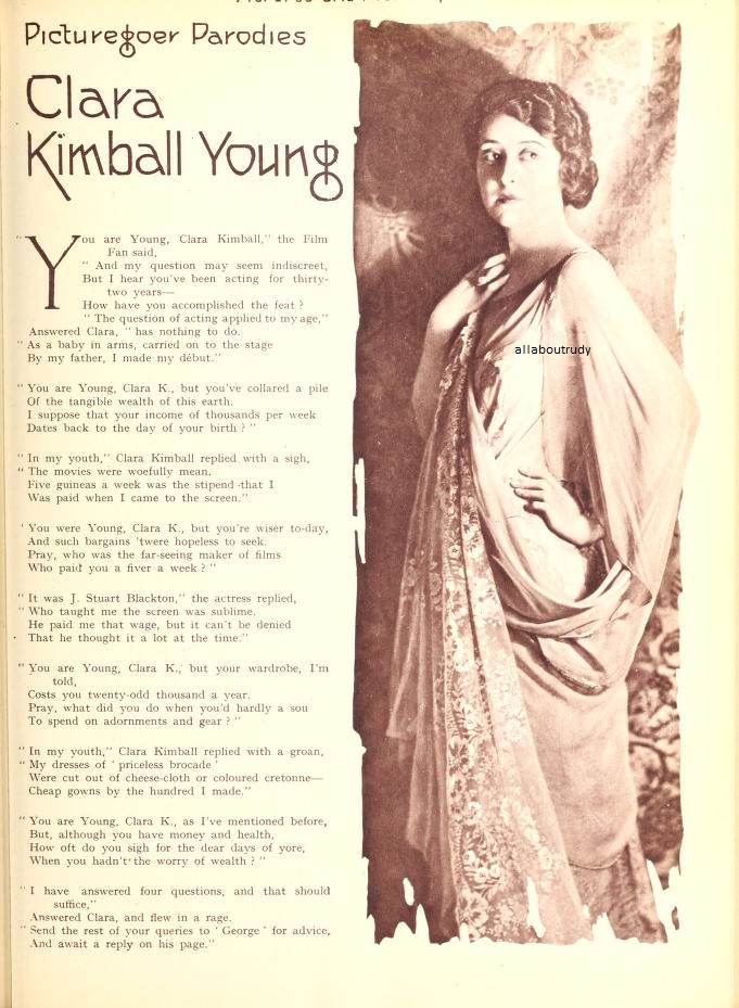 Twenty years ago, Clara Kimball Young had an annual income of $200,000, but the hand of ill fortune has swept away her wealth. Miss Young began her career on the stage when she was three. When pictures rose above the nickelodeon class, dramatic actresses were in demand and Miss Young rose to great heights in the higher type films. Her first picture “Cardinal Woolsey” made by Vitagraph in 1912, her Camille shocked the folk of yesteryear, but they sat up and took notice just the same. Her outstanding beauty, especially her magnificent dark eyes and her hands were the toast of the world. She received as many as 10,000 fan letters in one day. Perhaps the fan letter fad is passing, for today no star receives as much mail as that. Miss Young lives in Hollywood with her father, Edward Kimball, who is a favorite with the old-timers of the film colony. She has accepted the changes in her life philosophically.