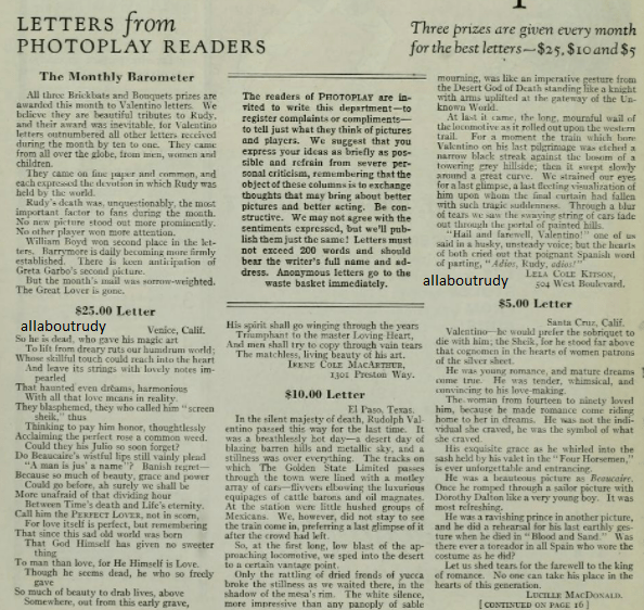 Rudolph Valentino has been dead for nine months and yet to hundreds of moving picture fans, he is still alive. United Artists through which Valentino distributed his films receives on average 15 letters a week addressed to Valentino, expressing admiration for his work, asking what his next movie will be and invariably asking for a photograph. Letters arrive from all over the world. One such letter came in from Chicago and a young girl wrote “I saw you in all of your pictures. I would like to know what pictures you are going to be in. Please give me one of your pictures”. Another Dear Mr. Valentino from Detroit “I am writing you a few lines to let you know that I am watching your work on the movie screen. I saw you in many pictures and I like them all very much. Please send me one of your photographs”. From Niles, Ohio “Rudolph, Will you please send me a picture?”. A girl from Treadelphia, West Virginia writes “I saw your pictures in the show and I thought it was very beautiful and would you please send me your picture”. “I like the way you play and would you send me one of your pictures” wrote another from Brooklyn New York. All mail is acknowledged, and the writers are informed Valentino is no longer living.