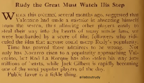 Pola Negri and Rudolph Valentino. Yes, really darlings. Last time, it was Pola and Rod La Rocque, following the denied story of the alluring Pola’s engagement to William Haines. To be sure, Pola and Rudolph are not engaged; that is unconditionally. Perhaps not at all. But if glances tell any story in which Cupid has a hand, if preferences, if public appearances together mean anything, then truly Cupid is working on this line if it takes all winter.